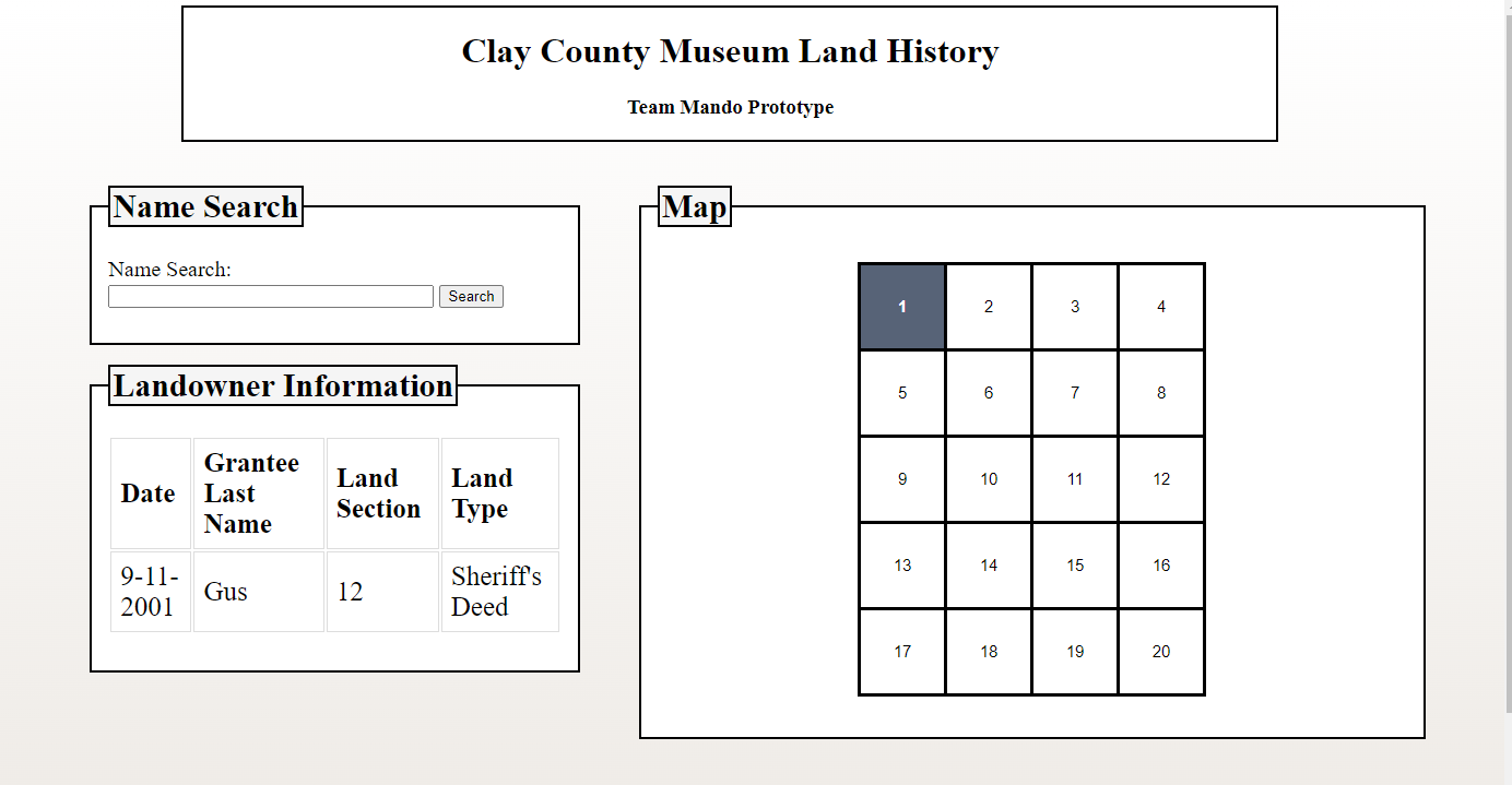 This project was a conceptual website for a land history search tool. This was a group project with the goal of presenting our ideas in a functional format to the museum of Clay County, Kansas. As a member of the "Mando" team, I designed the look and layout of the website. I also coded the HTML and CSS components. This project taught me how to create dynamic websites that can conform to both mobile and desktop views, an invaluable skill in today's mobile-first landscape.